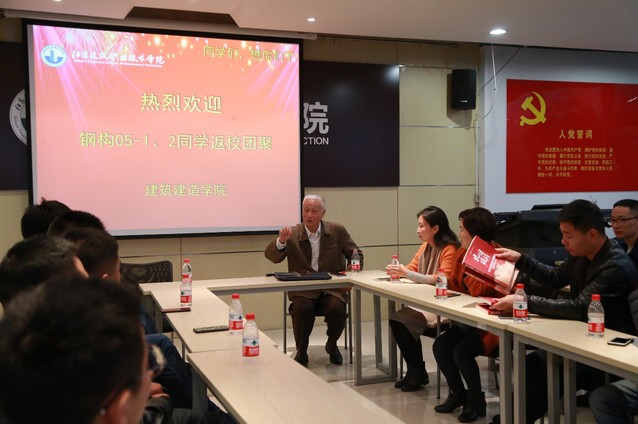 10点左右,同学们来到建筑建造学院的会议室,与学院领导、老师们进行了座谈会。此次聚会,当年的三位班主任:安沁丽老师、于殿宝老师以及赵峥老师欣然接受同学们的邀请,教务处处长戚豹、建造学院党总支书记孙武、钢结构专业主任孙韬和王培兴老师也都热情的参与其中,并对老校友们的回访,表示热烈欢迎。
