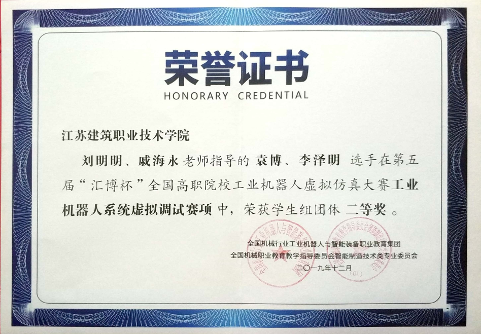 日前,第五届“汇博杯”全国高职院校工业机器人虚拟仿真大赛在常州机电职业技术学院落下帷幕。由刘明明、戚海永老师指导的机电17-4袁博、机制18-2李泽明组成的团队在工业机器人系统虚拟调试赛中获得二等奖。
