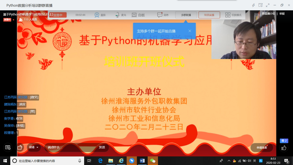 2月23日,徐州淮海服务外包职教集团2020年第一期企业培训《基于Python的机器学习应用》线上准时开班。此次培训是职教集团根据年初工作计划,报市教育局同意,由MK(中国)和市工业和信息化局、市软件行业协会共同举办。徐州市工业和信息化局处长郝春毅,徐州市软件行业协会会长吴芸,淮海经济区域34家软件企业一线工程师,部分高校老师和学生共178名学员参加了线上开班仪式。仪式由徐州市软件行业协会秘书长叶志江主持。