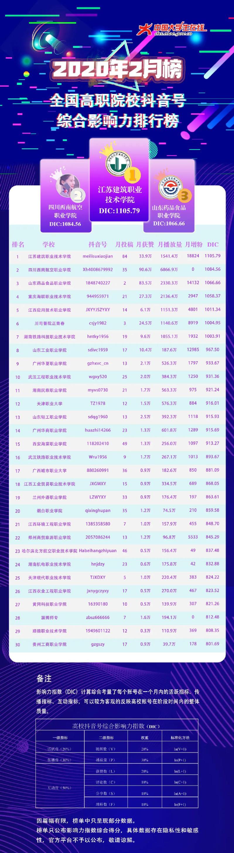 中国大学生在线综合投稿量、播放量、点赞量、评论量、分享数、增粉数等多个数据维度,对高校及高校短视频进行遴选,发布“全国高校短视频传播力”top排行榜2月榜(10件短视频)、“全国本科院校抖音号综合影响力”排行榜2月榜(30所高校)、“全国高职院校抖音号综合影响力”排行榜2月榜(30所高职院校)、“全国高校抖音号‘热点60秒’话题视频top10”排行榜2月榜(10件短视频)。