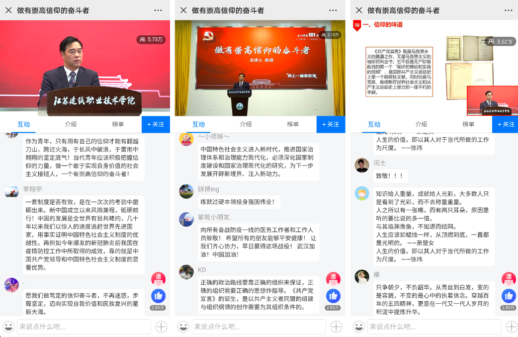 青年强则国家强,青年兴则国家兴,青年有信仰则国家有希望。韶华易逝,青春难留。思政课上,孙进详细介绍了学校几名参建火神山、雷神山的校友事例,他们就是在自己的岗位上尽职尽责的工作,肩负着一份家国情怀的责任,这就是信仰的力量。他还向全体建院学子发出号召,要以青春为驿站整装出发,增强“四个意识”,坚定“四个自信”,凝聚力量,走向新起点,走进新时代。