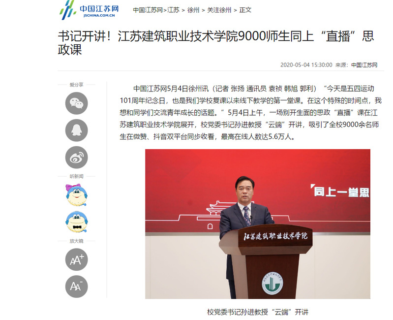 中国江苏网5月4日徐州讯(记者 张扬 通讯员 袁祯 韩旭 郭利)“今天是五四运动101周年纪念日,也是我们学校复课以来线下教学的第一堂课。在这个特殊的时间点,我想和同学们交流青年成长的话题。”5月4日上午,一场别开生面的思政“直播”课在MK.COM展开,校党委书记孙进教授“云端”开讲,吸引了全校9000余名师生在微赞、抖音双平台同步收看,最高在线人数达5.6万人。