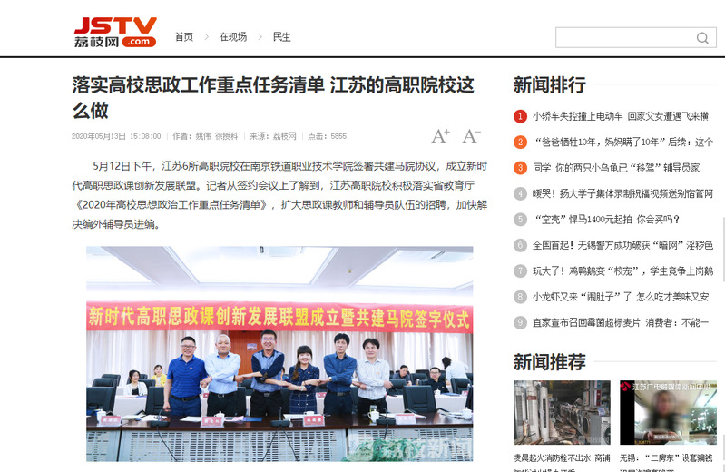 5月12日下午,江苏6所高职院校在南京铁道职业技术学院签署共建马院协议,成立新时代高职思政课创新发展联盟。记者从签约会议上了解到,江苏高职院校积极落实省教育厅《2020年高校思想政治工作重点任务清单》,扩大思政课教师和辅导员队伍的招聘,加快解决编外辅导员进编。