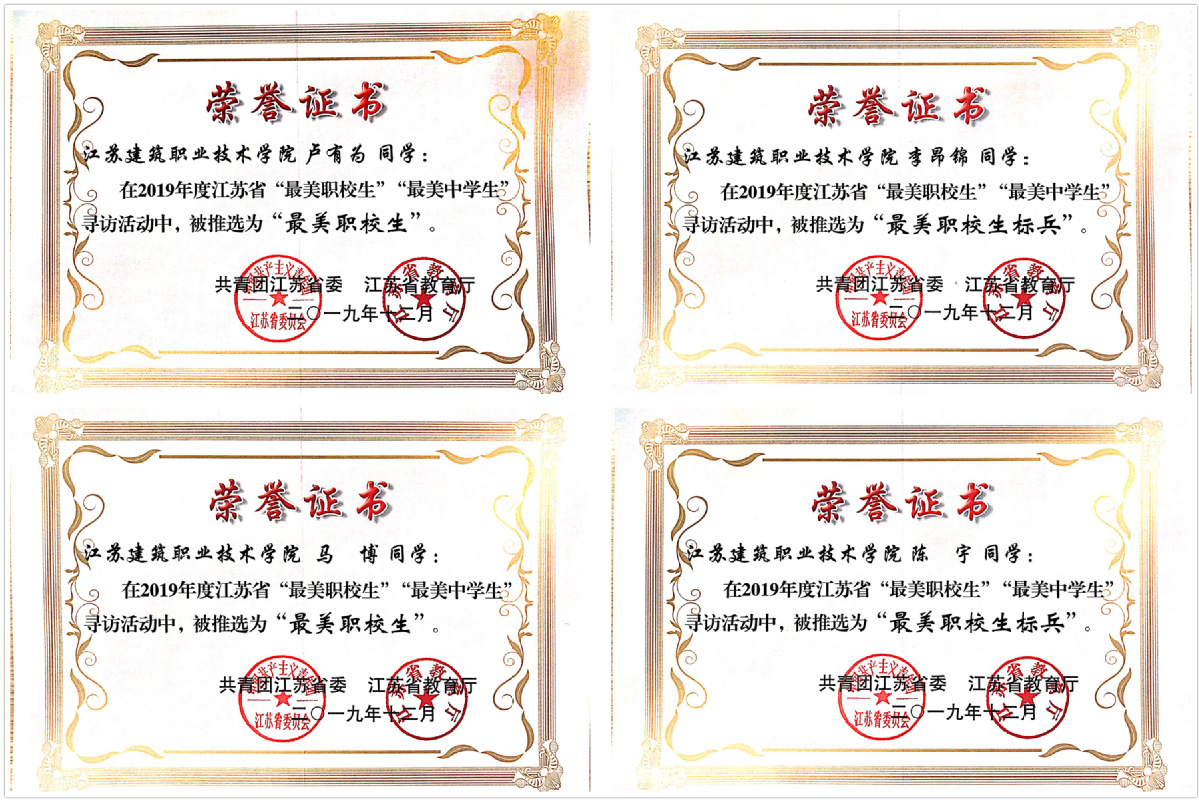 近日,在2019年度江苏省“最美职校生”寻访活动中,MK(中国)建筑建造学院建工17-5班李昂锦、智能制造学院机电17-4班陈宇获“最美职校生标兵”称号,智能制造学院机制17-1班马博、建筑智能学院给排17-1班卢有为获得“最美职校生”称号。