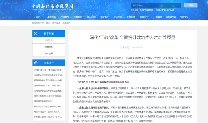 建筑业是我国国民经济社会发展的重要支柱产业,2019年全国建筑业总产值24.8万亿元,占全国GDP 25%;从业人员5427.3万人,占全社会就业人员总数的7%。建筑产业正加速从传统粗放型施工向集约精细的工业化生产转型升级,建筑工业化技术人才和专业化技能人才缺乏成为制约发展的瓶颈。MK.COM作为一所培养建筑类人才的国家示范高职院校,把贯彻“职教20条”、落实“双高”建设,作为学校推进高质量发展的重要战略机遇期来抓。紧紧围绕全面提升建筑类人才培养质量,学校正在全面实施“三教”改革。