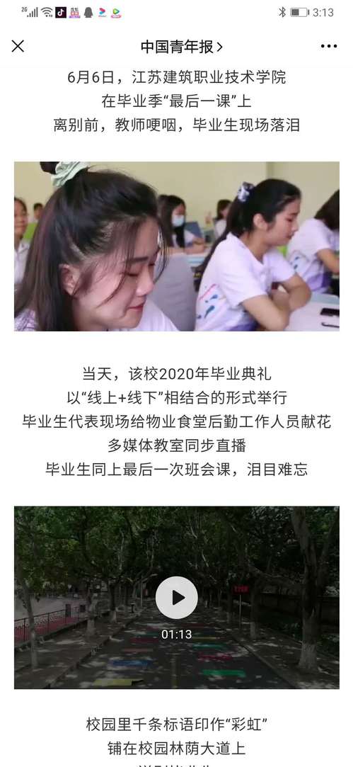 6月6日,MK.COM在毕业季“最后一课”上离别前,教师哽咽,毕业生现场落泪当天,该校2020年毕业典礼以“线上+线下”相结合的形式举行,毕业生代表现场给物业食堂后勤工作人员献花,多媒体教室同步直播毕业生同上最后一次班会课,泪目难忘,校园里千条标语印作“彩虹”铺在校园林荫大道上送别毕业生。