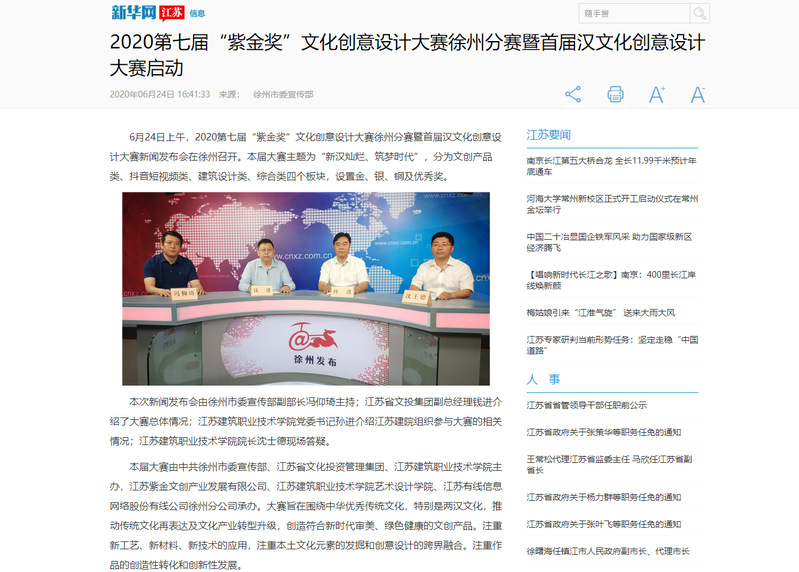 6月24日上午,2020第七届“紫金奖”文化创意设计大赛徐州分赛暨首届汉文化创意设计大赛新闻发布会在徐州召开。本届大赛主题为“新汉灿烂、筑梦时代”,分为文创产品类、抖音短视频类、建筑设计类、综合类四个板块,设置金、银、铜及优秀奖。