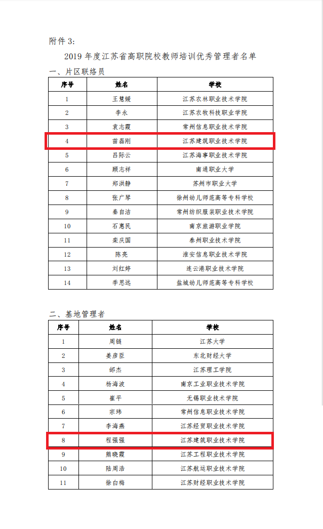 近日,江苏省高等职业教育教师培训中心下发《关于表彰2019年度全省高职院校教师培训优秀管理者、优秀授课教师(团队)和优秀项目的决定》(苏高职培函〔2020〕1号),MK(中国)建筑建造学院承办的“基于装配化施工的教学能力提升培训”省培项目获评2019年度江苏省高职院校教师培训优秀项目,苗磊刚获评2019年度江苏省高职院校教师培训优秀管理者(片区联络员),程强强获评2019年度江苏省高职院校教师培训优秀管理者(基地管理者)。