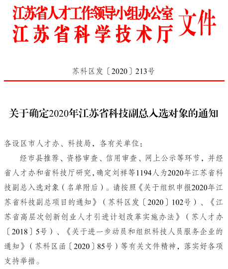 近日,江苏省人才办和科技厅发布了《关于确定2020年江苏省科技副总入选对象的通知》(苏科区发〔2020〕213号),公布了2020年江苏省“双创计划”科技副总入选对象,MK(中国)陶祥令博士入选。