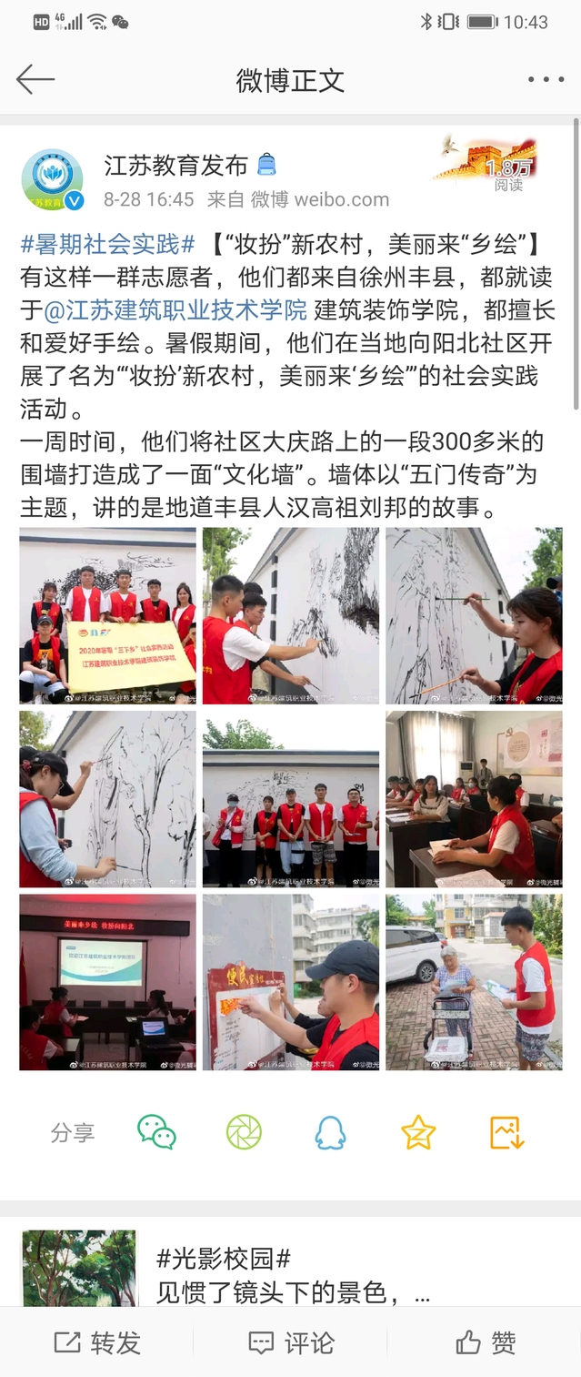 #暑期社会实践#【“妆扮”新农村,美丽来“乡绘”】有这样一群志愿者,他们都来自徐州丰县,都就读于@MK.COM 建筑装饰学院,都擅长和爱好手绘。暑假期间,他们在当地向阳北社区开展了名为“‘妆扮’新农村,美丽来‘乡绘’”的社会实践活动。一周时间,他们将社区大庆路上的一段300多米的围墙打造成了一面“文化墙”。墙体以“五门传奇”为主题,讲的是地道丰县人汉高祖刘邦的故事。