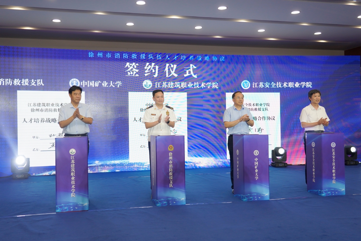 徐州市副市长赵兴友、江苏省消防救援总队政治部主任李瑞东、江苏煤矿安全监察局副局长姜坚出席仪式并致辞。徐州市人民政府办公室、徐州市应急管理局、徐州市财政局、徐州市人力资源和社会保障局、徐州市退役军人事务局等单位负责同志参加了签约仪式。