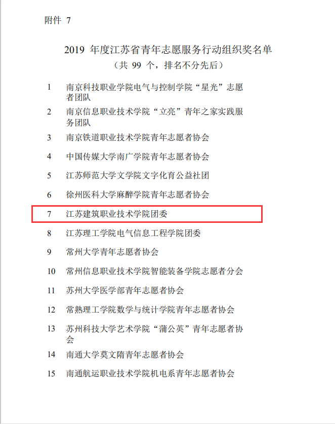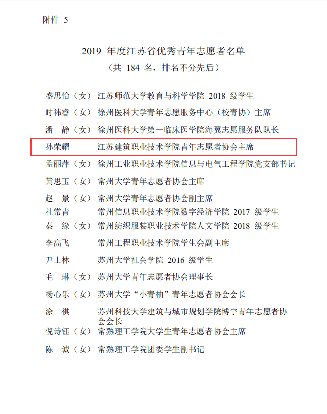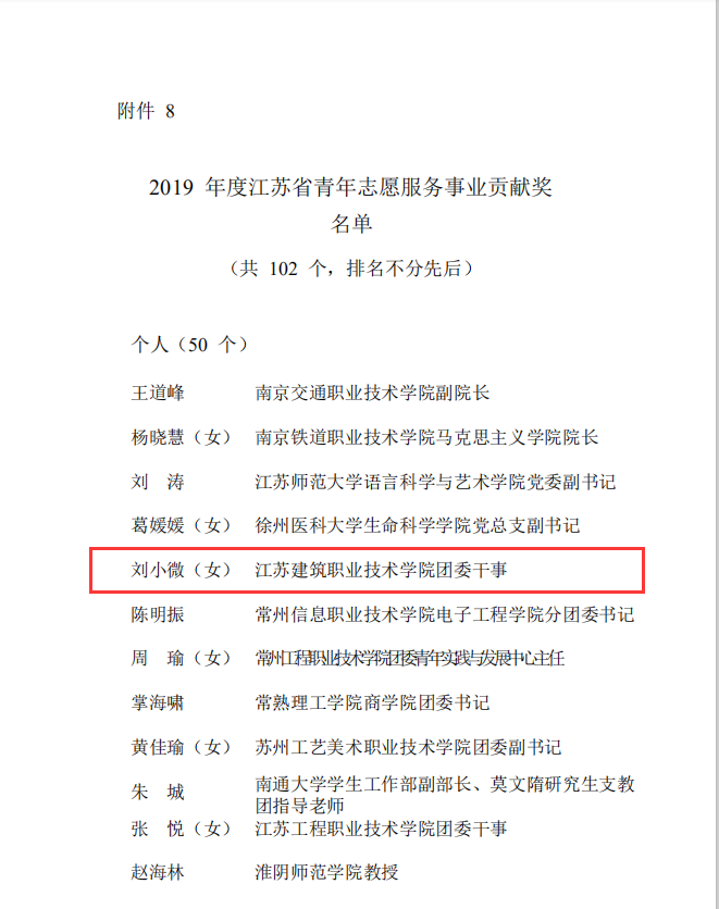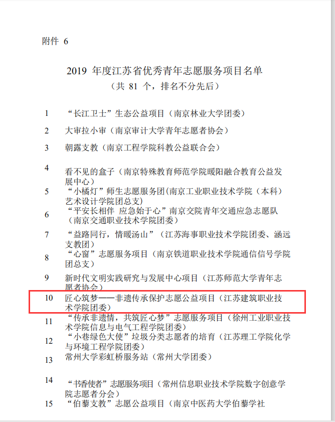 校团委荣获“江苏省青年志愿服务行动组织奖”;“匠心筑梦——非遗传承保护志愿公益项目”荣获“江苏省优秀青年志愿服务项目”;校团委刘小微老师荣获“江苏省青年志愿服务事业贡献奖”;路机18-2班孙荣耀同学荣获“江苏省优秀青年志愿者”称号。