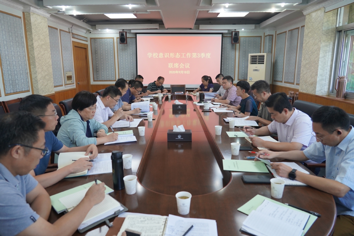党委组织部、党委办公室、执纪审查处、党委教师工作部、党委学工部、党委保卫部、团委、教务处、科技处、信息中心、图书馆、学报、质量办、马克思主义学院、国际学院等单位负责人就第3季度意识形态工作情况作了详细介绍,分析存在的问题和风险,并就下一步如何抓好意识形态责任制落实作交流研讨。