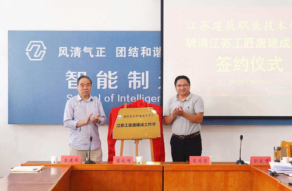 仪式上,蒋兆峰代表学校与唐建成共同为“江苏工匠唐建成工作室”揭牌,人事处处长宋丹萍与江苏工匠唐建成教授签署了高技能特殊人才柔性引进聘用合同。