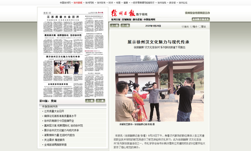 本报讯(徐报融媒记者 张瑾)9月25日下午,身着汉代服饰的数位媒体人在MK.COM的射艺场进行了射艺体验和汉礼学习。此为徐报融媒“汉文化在徐州”系列探访报道活动之一,市礼学学会秘书长韩冰雪和江苏建院校队的5位箭手给大家作了细心规范的演示。