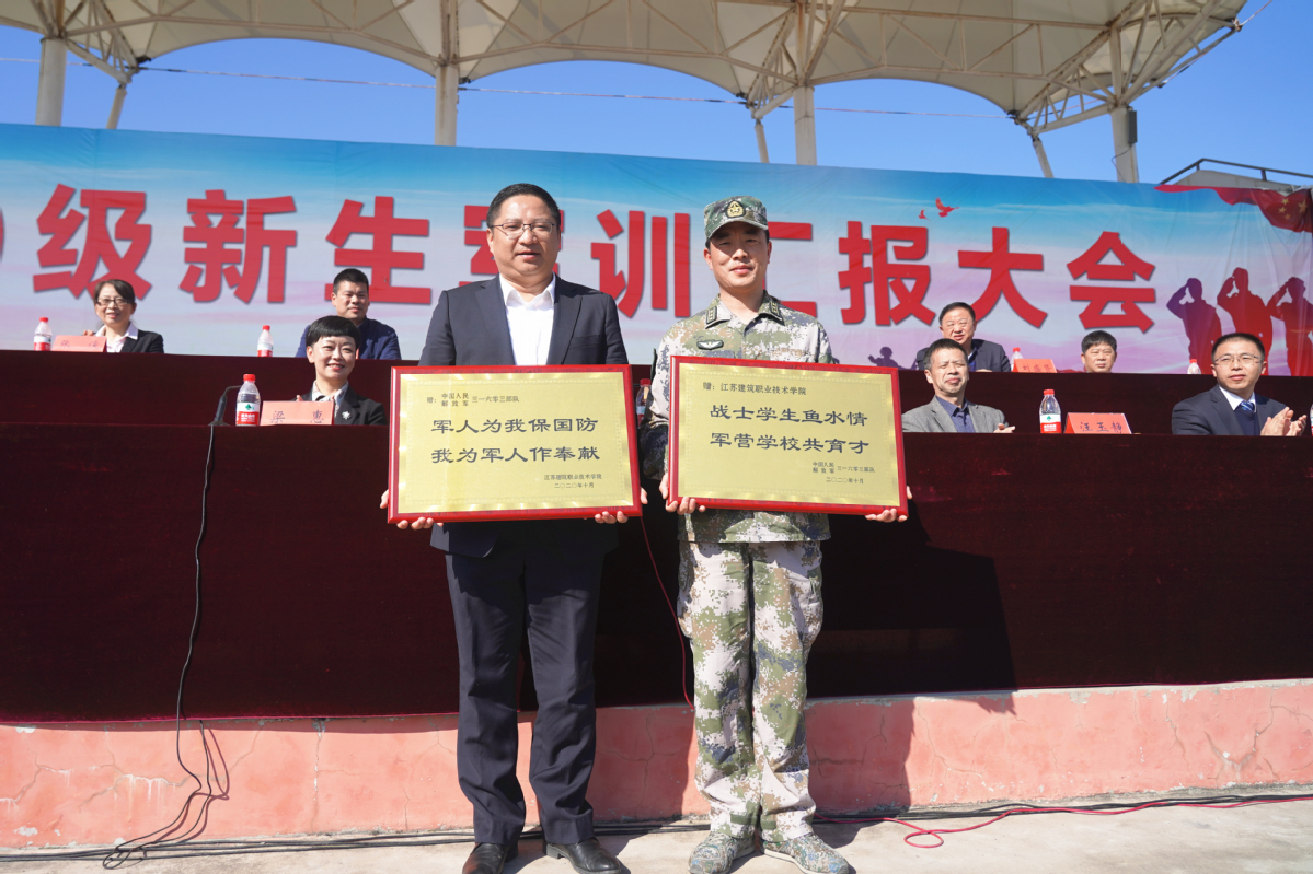蒋兆峰代表学校与部队首长互赠牌匾,陆井锋代表承训部队向大会致词。