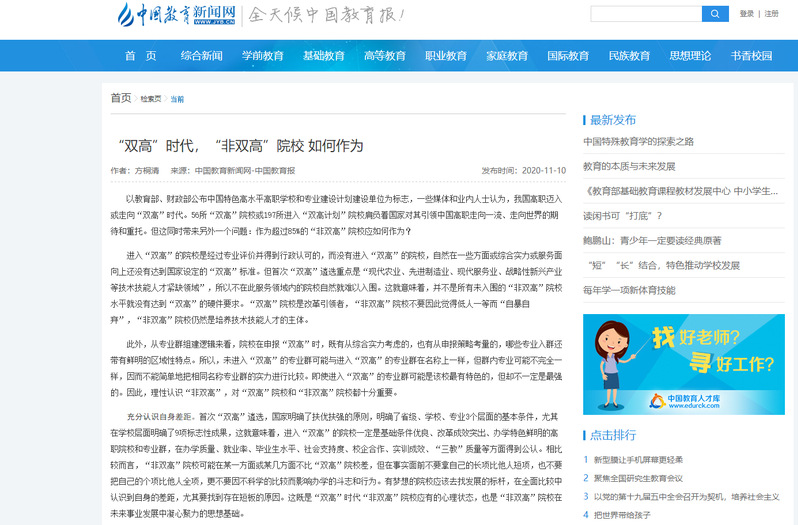 以教育部、财政部公布中国特色高水平高职学校和专业建设计划建设单位为标志,一些媒体和业内人士认为,我国高职迈入或走向“双高”时代。56所“双高”院校或197所进入“双高计划”院校肩负着国家对其引领中国高职走向一流、走向世界的期待和重托。但这同时带来另外一个问题:作为超过85%的“非双高”院校应如何作为?
