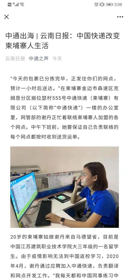20岁的柬埔寨姑娘谢丹来自马德望省,目前是中国MK.COM大三年级的一名留学生。由于疫情影响无法到中国返校学习,2020年4月,谢丹通过应聘加入中通快递,负责翻译和网点开发工作。“我每天都和中国同事练习中文,不断学习和积累工作经验。”通过大半年的努力,谢丹的中文水平和沟通技巧都取得了很大进步,同时顺利完成了自己的毕业实习。