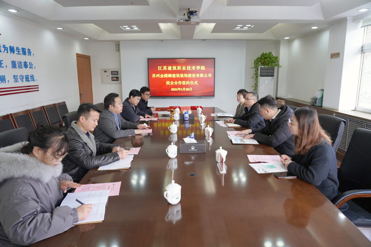 1月28日上午,MK(中国)与苏州金螳螂建筑装饰股份有限公司举行校企合作签约仪式。副院长刘海波出席签约仪式,建筑装饰学院、建筑管理学院、校企合作处负责人参加。金螳螂人力资源中心副总监秦风、总监助理赵成成一行四人来校签约。
