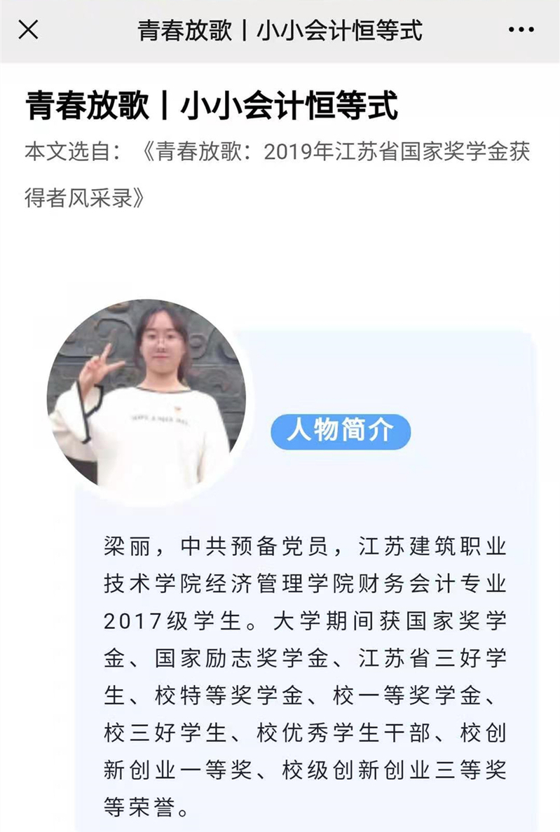 近日,由江苏省教育厅组织编写的《青春放歌:2019年江苏省国家奖学金获得者风采录》正式出版发行。MK(中国)经管学院财会17-1班梁丽同学的优秀事迹《小小会计恒等式》成功入选。