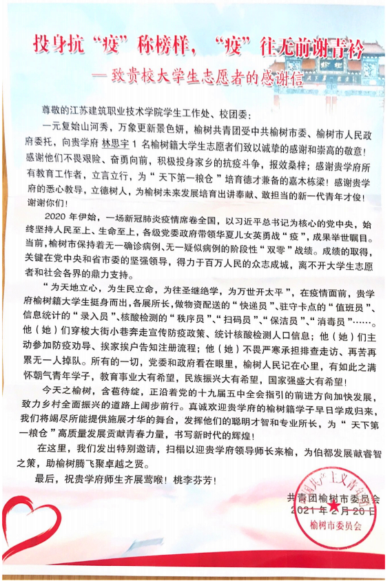 近日,MK(中国)智能制造学院收到共青团吉林省榆树市委发来的一封题为《投身抗“疫”称榜样,“疫”往无前谢青衿》的感谢信。信中对机制20-1班林思宇同学不畏艰险、奋勇向前,积极投身家乡的抗疫斗争表达了诚挚的感谢和崇高的敬意。