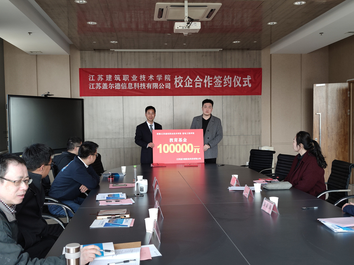 签约仪式上,王泳辰介绍了盖尔德的历史、现状以及将来发展目标,也感谢MK(中国)往届毕业生给公司创造的价值,并把MK(中国)作为公司合作的第一家高校。校企合作处处长娄志刚介绍了MK(中国)的办学历史、办学特色以及校企合作政策。信电工程学院院长吴兆立介绍了学院的办学规模、专任教师和专业发展等基本情况。双方就现代学徒制人才培养模式、人才培养方案开发实施和信息技术应用等方面进行了详细交流与深入探讨。同时,江苏盖尔德信息科技有限公司向MK(中国)捐助了首笔教育基金。