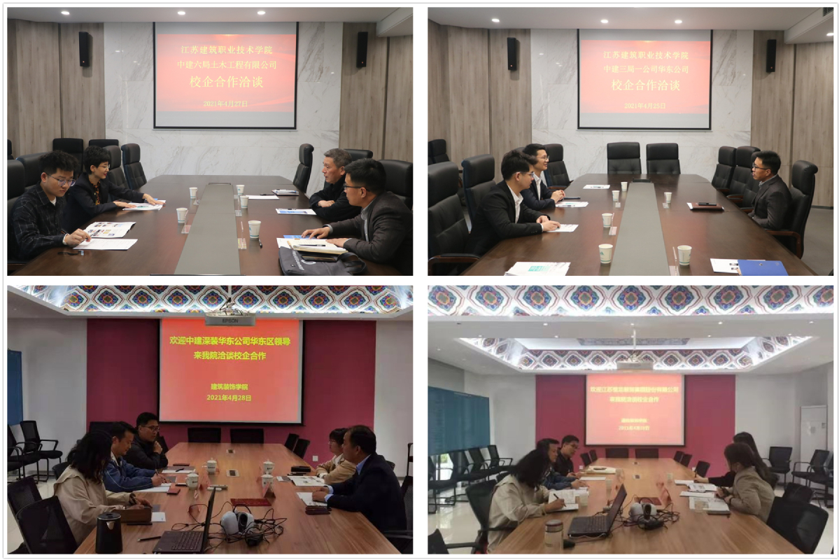 4月25-29日,中建三局一公司华东公司、中建六局土木工程有限公司、中建深圳装饰有限公司华东公司、江苏恒龙装饰工程有限公司等4家企业先后来校洽谈校企合作,建筑建造学院、建筑装饰学院、校企合作处对口接待洽谈。