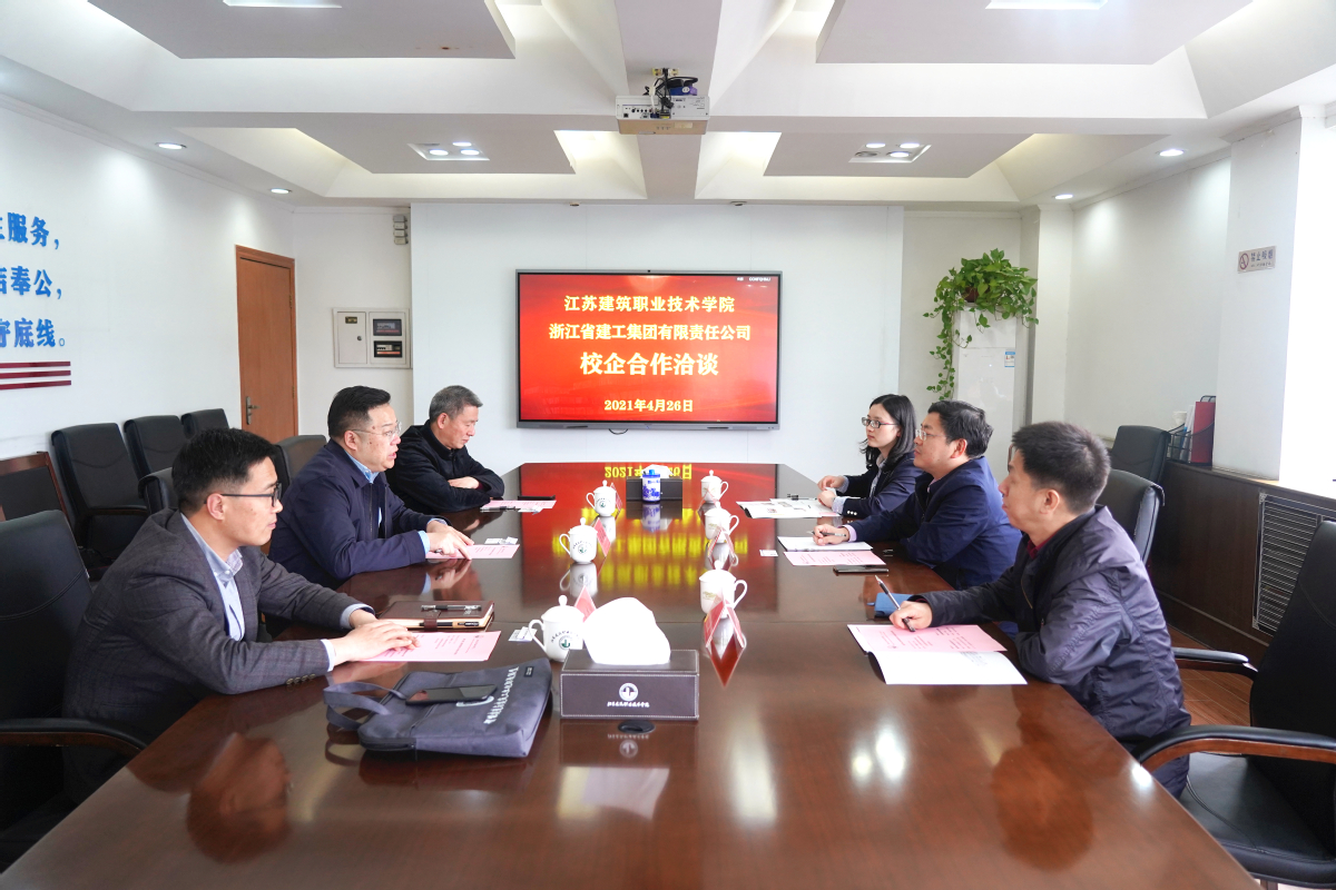 4月26日下午,浙江省建工集团有限责任公司党委副书记洪林平,江苏分公司党支部书记、总经理伍德祥,浙江建工集团党委组织(人力资源)部副部长舒雯等一行四人来校洽谈校企合作,学校副院长刘海波,建筑建造学院、校企合作处负责人参与洽谈交流。