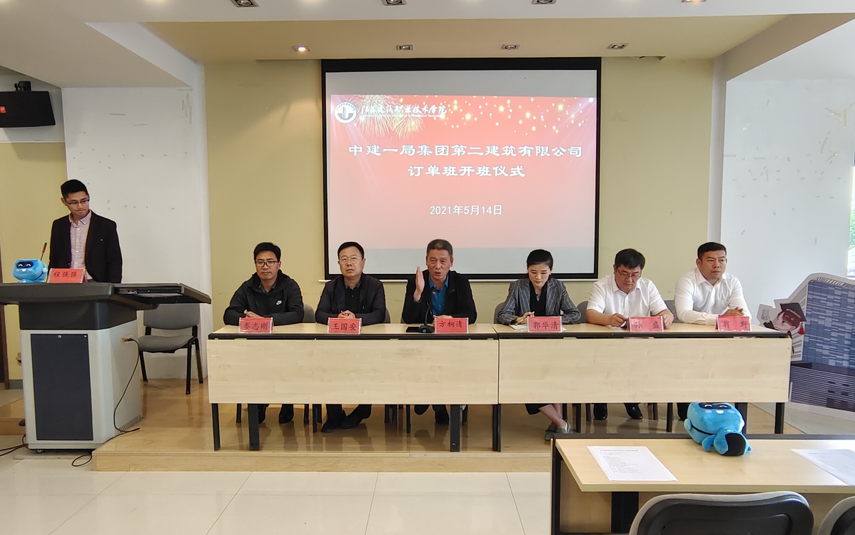 开班仪式上,建筑建造学院院长方桐清向订单班的同学表示热烈祝贺,并提出三点希望:一是艰苦奋斗,脚踏实地,发扬建院精神;二是敬业好学,理论联系实际;三是志存高远,学会做人、做事。中建一局二公司领导向订单班班主任马健原进行了授牌。