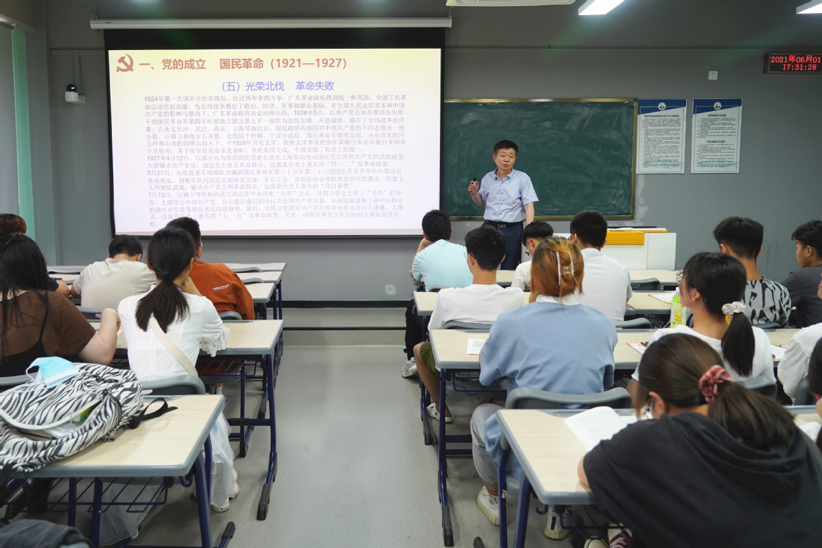 为深入贯彻落实中共中央办公厅、国务院办公厅印发的《关于深化新时代学校思想政治理论课改革创新的若干意见》等文件精神要求,发挥领导干部在宣讲党的理论、路线、方针、政策上的示范带动作用,根据《形势与政策》课教学安排,6月1日- 4日,党委书记孙进教授,院长沈士德教授,党委副书记梁惠,纪委书记魏勇,副院长曾凡远、刘海波、蒋兆峰围绕“党史的基本脉络解读”主题,为2019、2020级工程造价、机电一体化等20多个班级讲授了党史思政课。