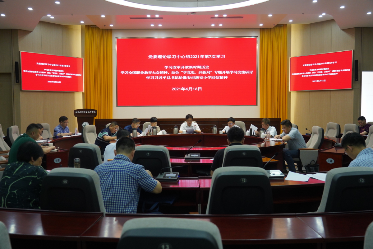 6月16日下午,学校党委理论学习中心组在学术报告厅召开2021年第7次学习会议,集中学习改革开放新时期历史、全国职业教育大会精神、习近平总书记给淮安市新安小学回信精神,结合“学党史、开新局”专题开展学习交流研讨。党委书记孙进教授主持会议,校党委理论学习中心组成员参加学习。