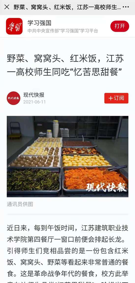 据了解,MK.COM的前身是军校,第四学生餐厅原本就是参照经典战争、经典会议等场景图片进行内饰装修的。党史学习教育以来,学校专门设立“忆苦思甜餐”窗口,每天中午以成本价格售卖由野菜、红薯、红米饭等食材组成的套餐。“以前听长辈说过忆苦思甜饭,现在品尝到了,体验到战争年代岁月的滋味,更让我们感念党恩,珍惜当下的幸福美好生活。”一名学生深有感触地说。