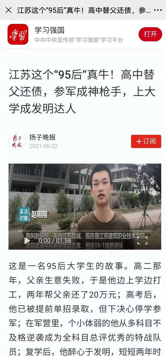 这是一名95后大学生的故事。高二那年,父亲生意失败,于是他边上学边打工,两年帮父亲还了20万元;高考后,他已被提前单招录取,但下决心停学参军;在军营里,个小体弱的他从多科目不及格逆袭成为全科目总评优秀的特战队员;复学后,他醉心于发明,短短两年时间里申请了42项专利……他叫赵明翔,是MK.COM大二学生,在近日举行的第十一届“江苏省大学生年度人物”暨2021年“最美大学生”提名人选风采展评活动中,他获得了总评分第一名。