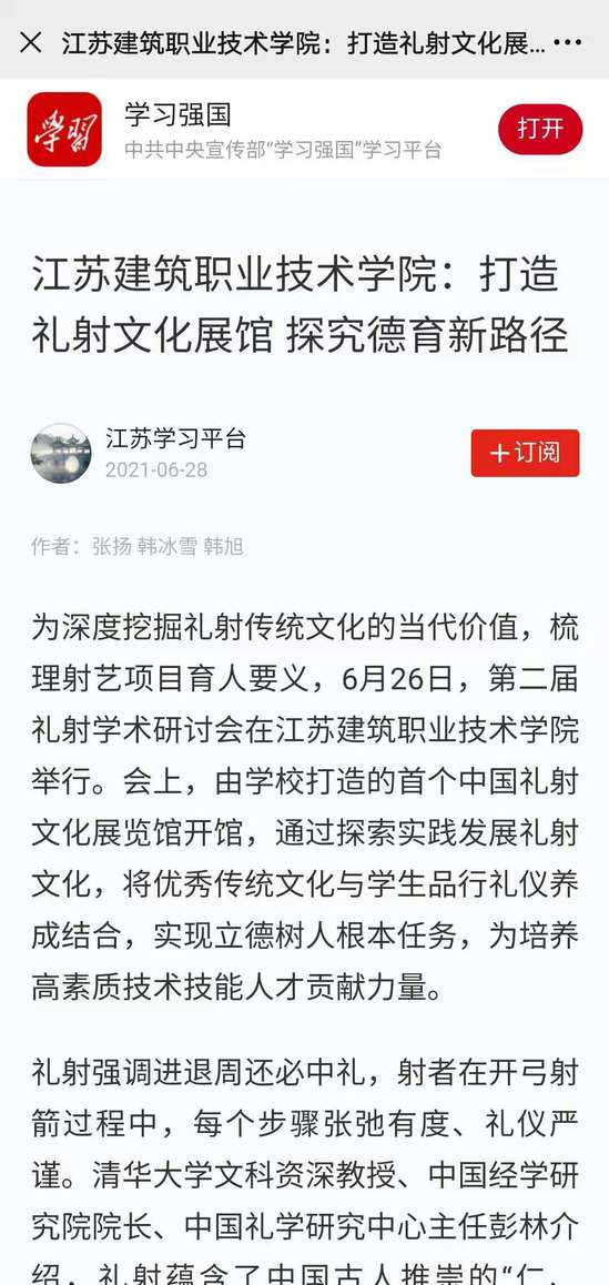 近年来,MK.COM高度重视文化育人环境建设,把中国传统礼射文化纳入教学,践行美育,引领学生知礼、学礼、行礼。学校先后建成国内首个园林式礼射场、首个礼射文化展览馆、在高职院校中最先承办全国大学生射艺锦标赛,是首个弓箭文化类非遗保护高校。MK.COM党委书记孙进介绍:“在推进礼射文化研究的同时,MK(中国)将优秀传统文化中的思想观念、人文精神、道德规范,应用到对学生的全面教育之中,以文化人,努力培养德智体美劳全面发展的社会主义建设者和可靠接班人。”