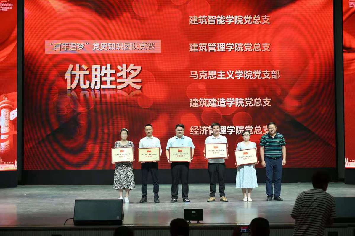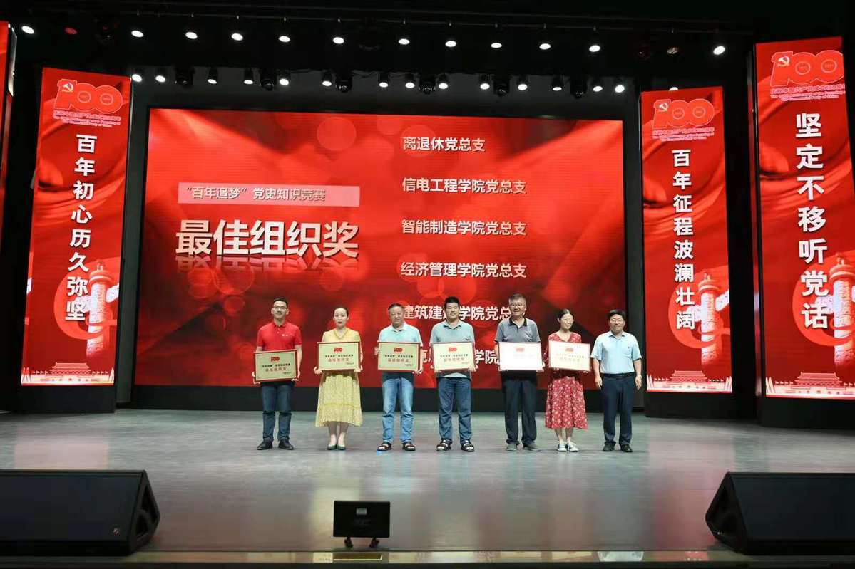 经过初赛的激烈角逐,共有6支队伍进入决赛。决赛分为团队必答、快速抢答、风险挑战、观众互动、黄金30秒等环节。比赛中,6组参赛选手展开激烈比拼,上演了一场精彩纷呈的党史知识盛宴。最终,机关第一党总支代表队摘得桂冠,信电工程学院党总支、机关第二党总支获得二等奖,继续教育学院党支部与离退休党总支的联合队、后勤管理服务中心党总支、智能制造学院党总支获得三等奖。离退休党总支、信电工程学院党总支、智能制造学院党总支、经济管理学院党总支、建筑建造学院党总支、马克思主义学院党支部获得“最佳组织奖”。