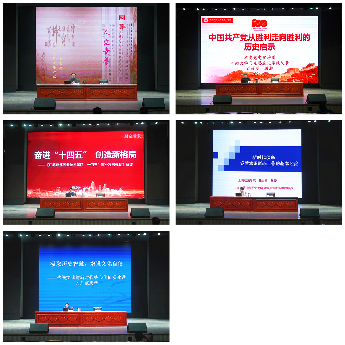 本次培训围绕人文素养、中国共产党党史、意识形态、新时代核心价值观、学校“十四五”规划等方面安排了5场讲座,他们分别是:中山大学历史系曹家齐教授的《国学与人文素养》;江苏省委党史宣讲团成员、江南大学马克思主义学院院长、博士生导师刘焕明教授的《中国共产党从胜利走向胜利的历史启示》;星空书院创始人、高等教育质量评价专家周凌波博士的《奋进“十四五”,创造新格局》;上海政法学院徐世甫教授的《新时代以来党管意识形态工作的基本经验》;苏州大学博士生导师臧知非教授的《汲取历史智慧,增强文化自信:传统文化与新时代核心价值观建设的几点思考》。整场培训以党史学习为基,兼顾文化与发展,为全校教师提供了一场回望过去、展望未来的学术盛宴。
