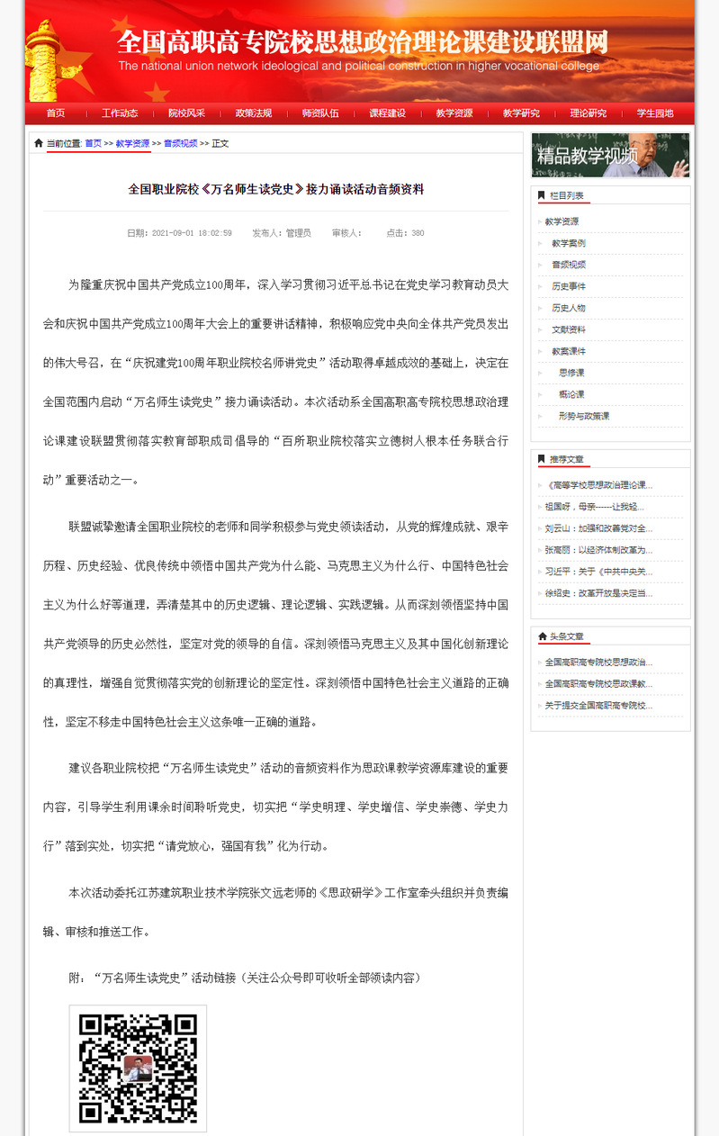 近日,据全国高职高专院校思想政治理论课建设联盟官方网站报道,MK(中国)马克思主义学院张文远老师牵头发起的“万名师生读党史” 接力诵读活动受到了该联盟的高度关注,被其收录并列为贯彻落实教育部职成司倡导的“百所职业院校落实立德树人根本任务联合行动”重要活动之一。