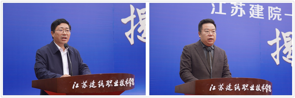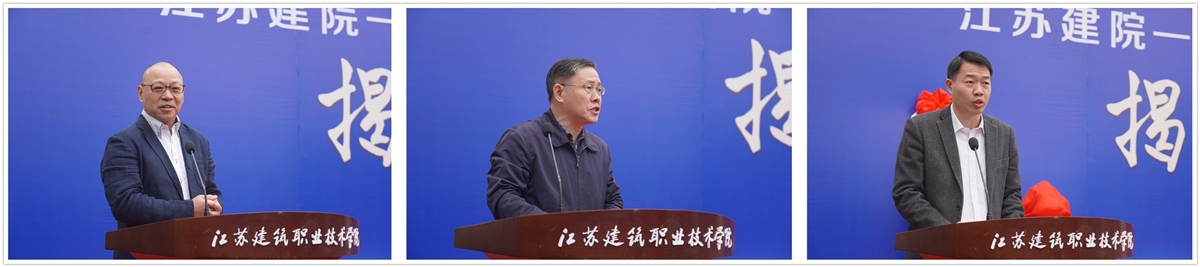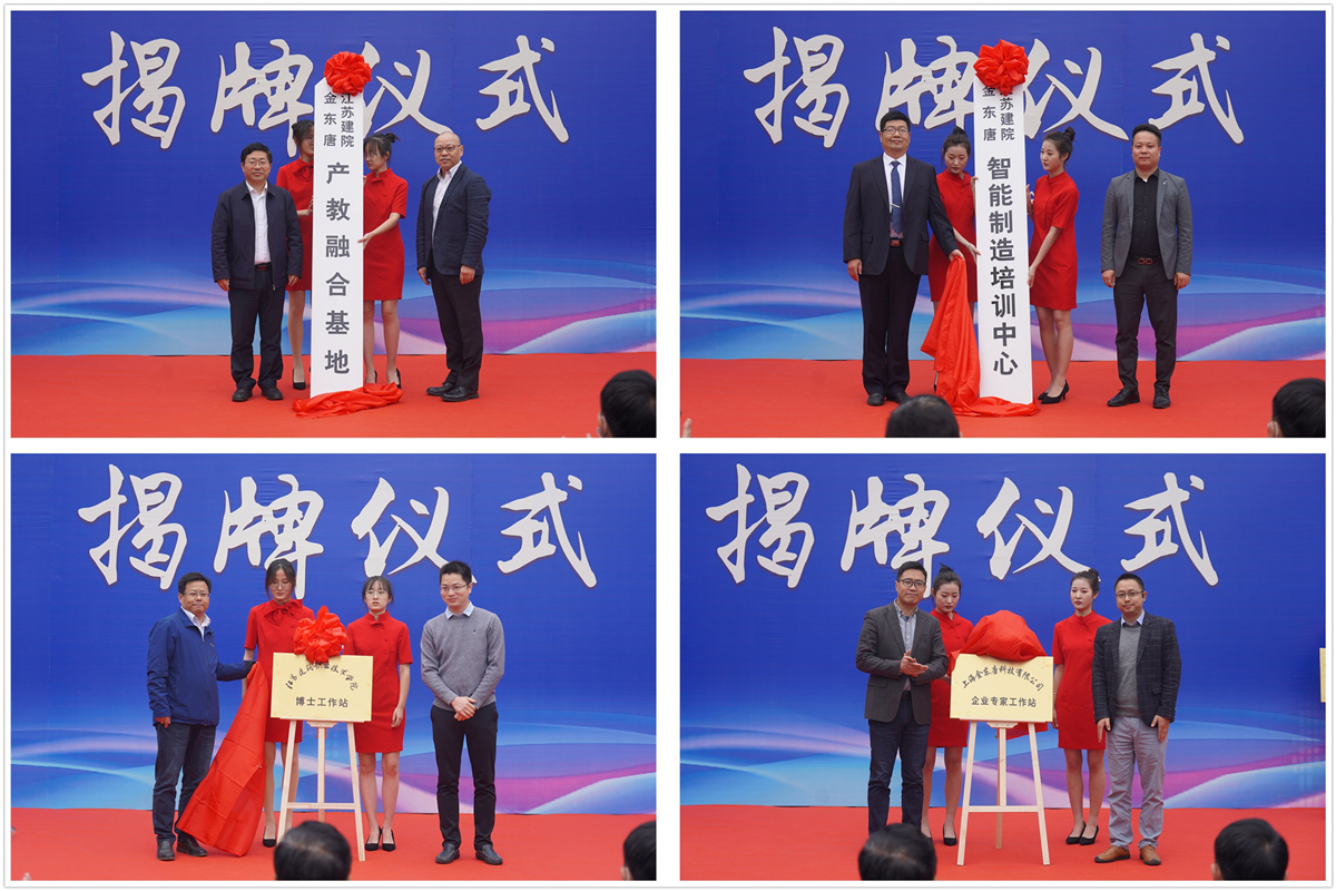 郑谦代表上海金东唐科技有限公司、邢邦圣代表兄弟院校、陈都标代表市人社局先后讲话。沈士德、郑谦等为“江苏建院-金东唐产教融合基地”、“江苏建院-金东唐智能制造培训中心”、“MK.COM博士工作站”、“金东唐企业专家工作站”揭牌。