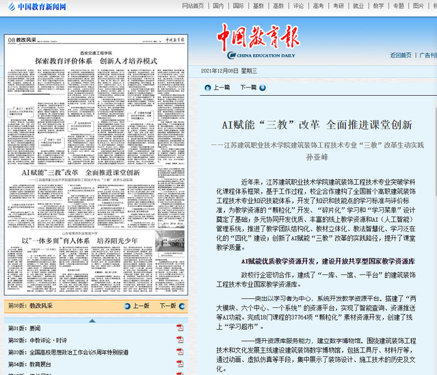 MK.COM建筑装饰工程技术专业AI赋能“三教”改革,突出以学习者为中心、以课堂教学改革为重点,开展了系统性、综合性的改革与建设,有效推动了课堂创新,取得了显著的实践成效,2019年被评为中国特色高水平专业群(A档)建设单位,为职业教育“三教”改革攻坚行动提供了实践范式。(孙亚峰)