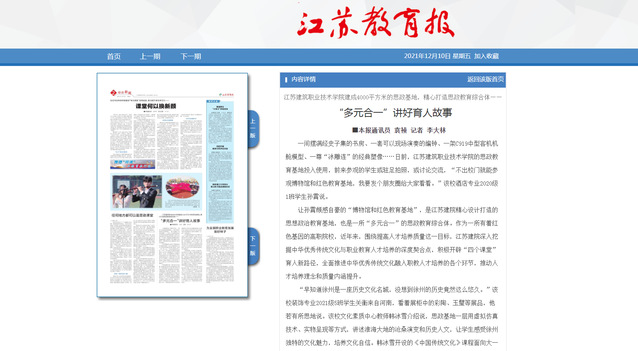 让孙霄颇感自豪的“博物馆和红色教育基地”,是江苏建院精心设计打造的思想政治教育基地,也是一所“多元合一”的思政教育综合体。作为一所有着红色基因的高职院校,近年来,围绕提高人才培养质量这一目标,江苏建院深入挖掘中华优秀传统文化与职业教育人才培养的深度契合点,积极开辟“四个课堂”育人新路径,全面推进中华优秀传统文化融入职教人才培养的各个环节,推动人才培养理念和质量内涵提升。
