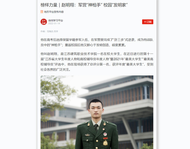 MK.COM地下与隧道工程技术专业19级1班班长,建筑建造学院学生会主席,泉山区人民武装部安全警戒连预备役战士……赵明翔笑着告诉记者:“身上的责任越来越重,需要付出的时间也越来越多,但很享受这样的过程,这是一种不同于部队的锻炼自己的方式。”