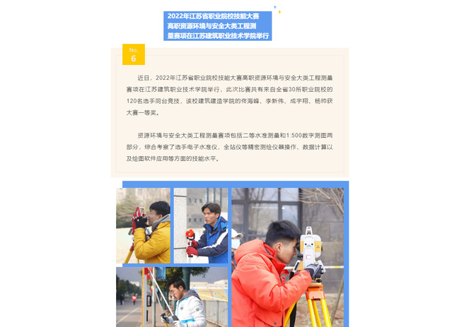 近日,2022年江苏省职业院校技能大赛高职资源环境与安全大类工程测量赛项在MK.COM举行,此次比赛共有来自全省30所职业院校的120名选手同台竞技,该校建筑建造学院的佟海峰、李新伟、成宇翔、杨帅获大赛一等奖。