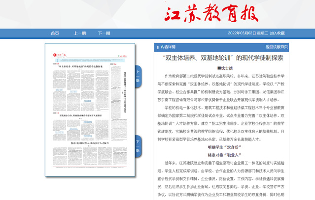 为推动现代学徒制项目顺利实施,培养具有专业技能与工匠精神的高素质人才,江苏建院建立了互聘共用、双向挂职锻炼、横向联合技术研发和专业建设的双导师机制,打造了一支高素质现代学徒制双导师队伍团队。学校印发《现代学徒制双导师队伍实施意见》,各专业选聘企业技术骨干人员作为企业导师在校内校外为学生讲课、指导实践,同时本校教师也到企业挂职锻炼、联合技术研发。