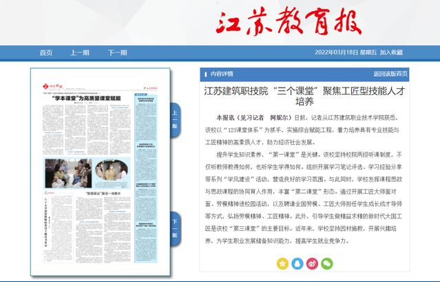 提升学生知识素养,“第一课堂”是关键。该校坚持校院两级听课制度,不仅听教师教得如何,也听学生学得如何。组织开展学习笔记评选、学习经验分享等系列“学风建设”活动,营造良好的学习氛围。与此同时,学校发挥课程思政与思政课程的协同育人作用,丰富“第二课堂”形态。通过开展工匠大师面对面、劳模精神进校园活动,以及聘请全国劳模、工匠大师担任学生成长成才导师等方式,弘扬劳模精神、工匠精神。此外,引导学生做精益求精的新时代大国工匠是该校“第三课堂”的主要目标。近年来,学校坚持因材施教,开展兴趣培养,为学生职业发展储备知识能力,提高学生就业竞争力。