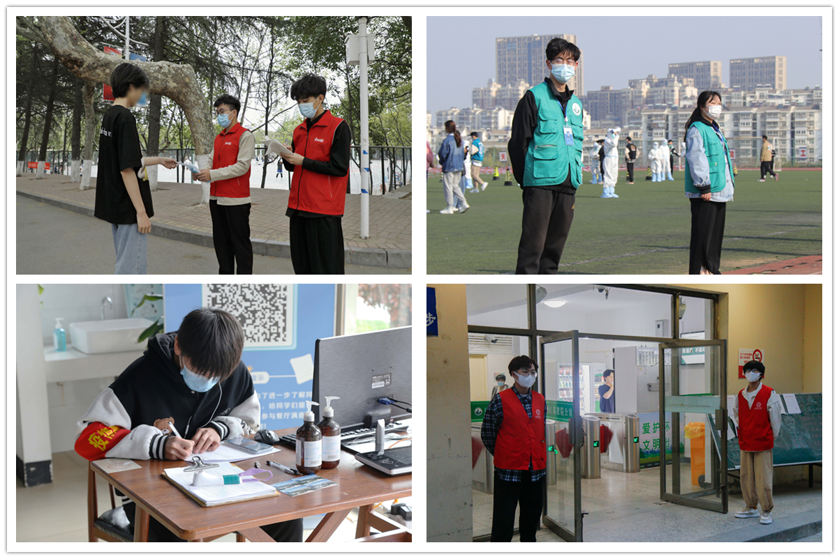 自4月1日起,青年志愿者在校团委的号召下积极响应、迅速动员,有效助力校园疫情防控工作。期间,各二级学院辅导员带领学生每日分时段于人流密集区域开展校园巡查工作,重点检查学生有无违反校园疫情防控规定,监督提示师生佩戴口罩;身披红马甲的学生志愿者全天候分点位散布在校园各处,协助驻校教职员工完成体温测量、健康码查验、队伍秩序维持等工作,并为物资匮乏的学生登记发放口罩。