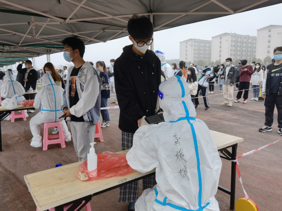 快速转变角色,做好物质保障。学院全体党员干部第一时间响应学校号召,积极投身到疫情防控校园保卫战“现场”,迅速转变成志愿者,成为一名光荣的“大白卫士”,冲锋在第一线,战斗在最前沿。根据学校疫情防控安排,学院主要负责师生核酸检测的物资对接、准备、调配、分发、现场排序、物资联络等工作。学院在保障每天在校师生核酸检测率20%(约2600人)基础上,现已圆满完成了4轮全员(累计约41000人次)核酸检测的物资保障任务。党总支书记龚媛媛、副院长王东主动加入“党员应急预备队”“党员干部住校工作组”,入驻校园,投入到疫情防控工作中。