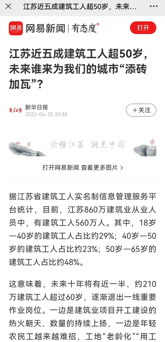 这意味着,未来十年将有近一半、约210万建筑工人超过60岁,逐渐退出一线重要作业岗位。一边是建筑业项目开工建设的热火朝天、数量的持续上扬,一边是年轻农民工越来越难招,工地“老龄化”“用工荒”日益凸显。未来,谁来为我们的城市“添砖加瓦”?