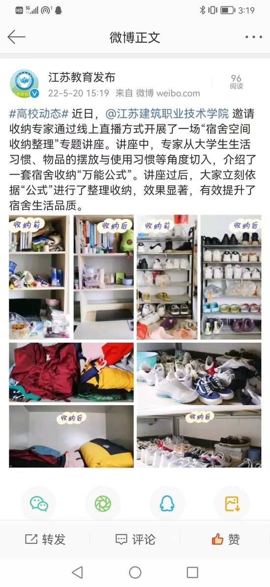 #高校动态#近日,@MK.COM 邀请收纳专家通过线上直播方式开展了一场“宿舍空间收纳整理”专题讲座。讲座中,专家从大学生生活习惯、物品的摆放与使用习惯等角度切入,介绍了一套宿舍收纳“万能公式”。讲座过后,大家立刻依据“公式”进行了整理收纳,效果显著,有效提升了宿舍生活品质。