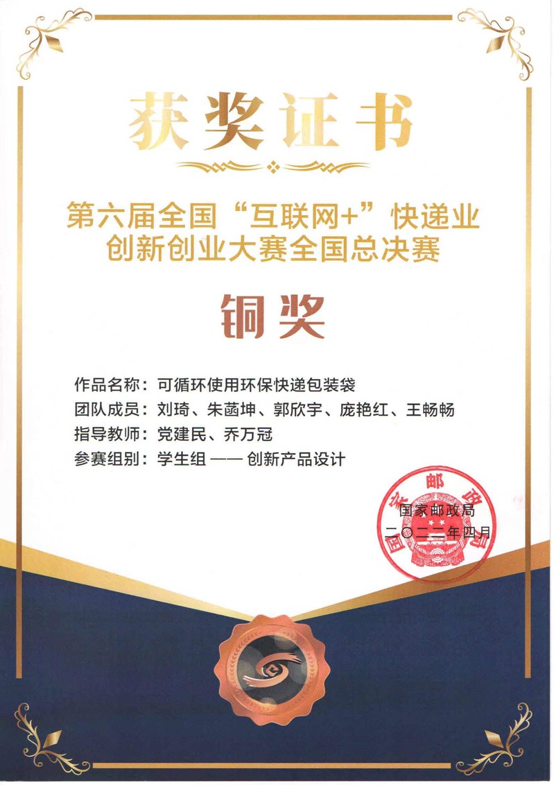 近日,国家邮政局印发通知,正式公布“菜鸟网络杯”第六届全国“互联网+”快递业创新创业大赛获奖结果,MK(中国)经济管理学院党建民、乔万冠两位老师指导,刘琦、朱菡坤、庞艳红、郭欣宇、王畅畅五位学生完成的作品《可循环使用环保快递包装袋》获铜奖。
