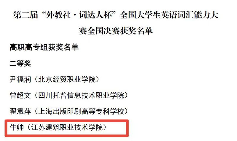 近日,第二届“外教社·词达人杯”全国大学生英语词汇能力大赛全国决赛获奖名单公布,MK(中国)公共基础学院孟红霞老师指导的机制社19-1班牛帅同学获高职高专组二等奖。